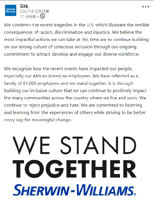 获悉,全球涂料巨头美国宣伟(Sherwin-Williams)今日发表声明称, 我们谴责最近发生在美国的悲剧,这表明了种族主义、歧视和不公正的可怕后果。我们相信,此时此刻,我们能够采取的最有效的行动是, 通过我们持续致力于吸引、发展和调动多样化的员工队伍,继续建立我们自觉包容的强大文化。