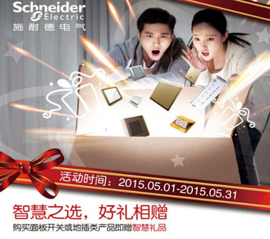 2015年5月1日 - 2015年5月31日期间,施耐德电气推出三重优惠惊喜!第一重:指定门店到店有礼,凡到店顾客均可以凭礼品兑换码至指定门店领取价值15元的USB迷你风扇1个;第二重:买赠活动,活动期间凡购买满1488元,即获赠价值59元节能壁灯1个,购买满2288元,即获赠价值149元空气净化器1个;第三重,分享惊喜,凡是分享购物经历的消费者,还有机会获赠精美礼品1份。