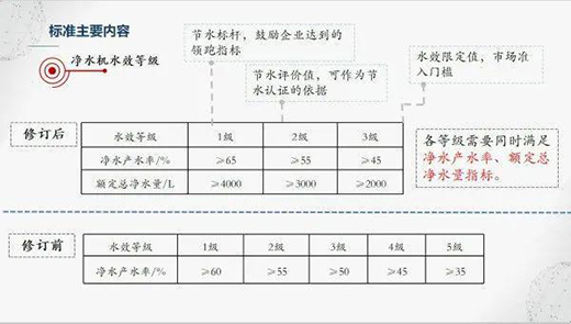 原国标《反渗透净水机水效限定值及水效等级》将水效等级分为5级,指标只有净水产水率,最低的第5级为≥35%,即1升自来水净化后产生350毫升净水,最高1级水效的净水产水率≥60%。新修订的水效国家标准水效等级包括净水产水率和额定总净水量这两个指标,各3级,最低的3级水效净水产水率≥45%,且额定总净水量≥2000升;最高的1级水效净水产水率≥65%,且额定总净水量≥4000升。