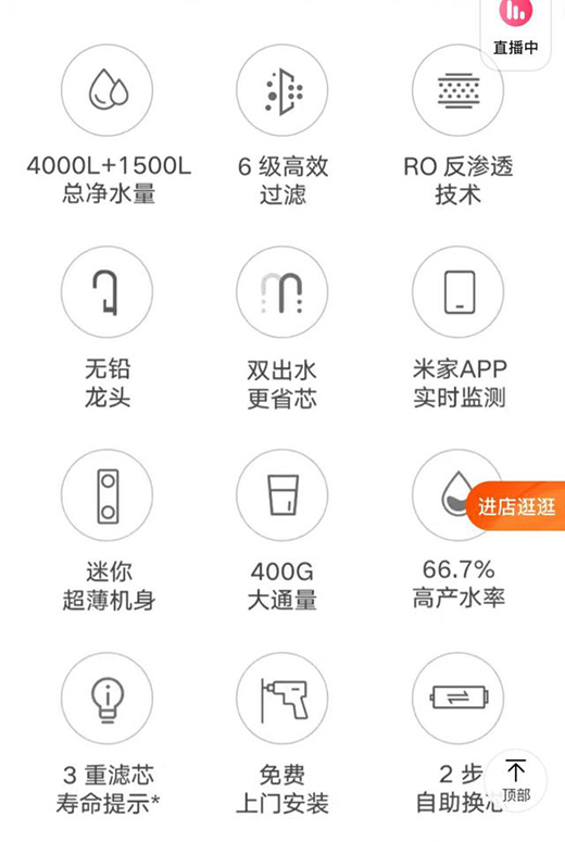 相比较而言,小米净水机的表述更为明确,比如小米净水器800G,在显眼处就可能看到额定总净水量为9800升,以及准确的净水产水率≥66.7%。