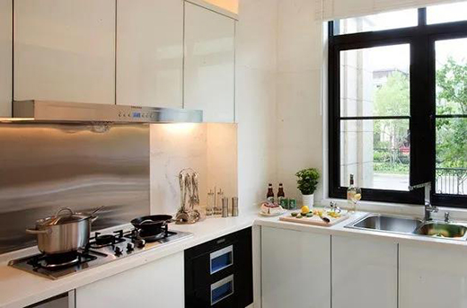 在厨房灶台墙面的选材上,更多地考虑大块、平整、深色的瓷砖,可以减少接缝处藏污纳垢;或者使用整块不锈钢墙面,油渍一擦即除,还能避免墙面变色。