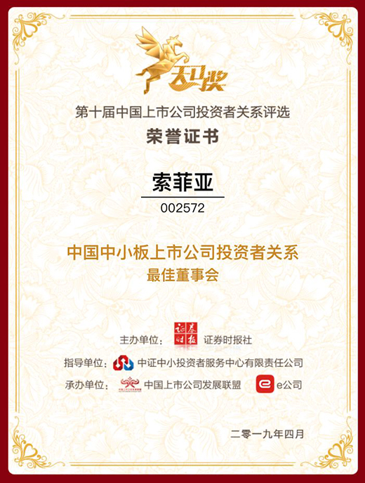 4月26日,证券时报2019首届中国上市公司高质量发展论坛暨“天马奖”第十届中国上市公司投资者关系评选颁奖典礼在北京举行,索菲亚(002572)荣获“最佳董事会”称号,这已是索菲亚第三次获奖。公司董秘潘雯姗女士获“最佳董秘”称号。