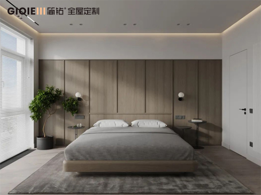 主卧,呈现保有简洁与纯粹的视感维度,木饰面与肤感板的组合,延伸出墙、柜与门的序列感,构造起温馨的生活空间。