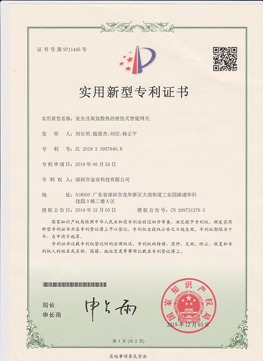 1、安全且高效散热的壁挂式智能网关(专利证书号:第9711445号)