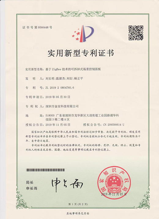 2、基于ZigBee技术的可拆卸式场景控制面板(专利证书号:第9566448号)