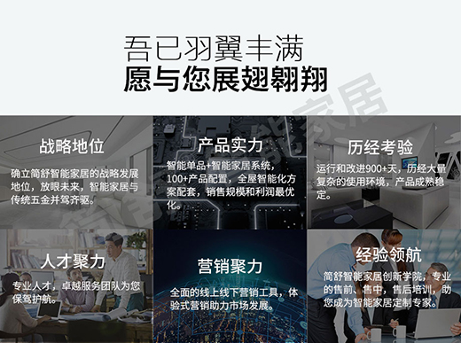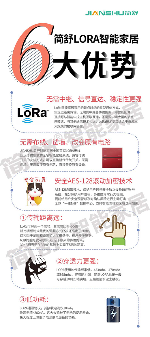 智能家居行业多年来一直存在有线与无线那个更好的争议,毫无疑问,在智能家居行业发展初期,不管是有线,还是无线都无法促进行业的快速发展,有线智能家居的稳定性好,但是安装难、价格高、后期拓展、维护困难,无线智能家居价格便宜、安装方便,但是存在信号传输距离短、信号穿墙能力弱、稳定性差等问题,只适合家庭小区域的智能化,因此,智能家居行业一直被称之为”软肋“,导致了智能家居行业出现了外冷内热的现象,经过多年的努力,简舒智能家居自主研发生产的LORA智能家居终于成功的解决了智能家居行业多年来有线与无线之争,LROA作为一种能够替代有线智能家居的无线通讯协议,具备了信号传输距离远、信号穿墙能力强(可穿8层水泥钢筋墙)、信号抗干扰能力高(同频率同时间发出也不会受到干扰)、系统稳定性好、安装方便、价格实惠等天然优势,别墅、复式楼等大户型房子只需要一个LORA智能家居网关,即可控制全屋智能家居终端设备,真正实现了智能家居产品在智能化改造方案中落地可行,为家庭、别墅、楼盘、酒店、办公室等不同类型的工程项目提供了一站式解决方案,突破了智能家居行业发展瓶颈,为智能家居行业的高速发展作出了具大贡献,是智能家居行业加盟的优选品牌。