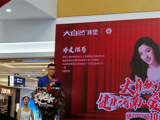居然之家商都店总经理唐绿化、大自然公司营销北区总经理程晓虎、河南省红十字血液中心献血服务科副主任沙建分别上台致辞,普及献血知识,提高对定期献血必要性的认识。用自己的行动向社会奉献爱心,发扬珍惜生命、友爱互助的高尚情操,营造一手抓健康睡眠一手抓爱心公益的氛围。对无偿献血的志愿者们给予赞扬及肯定同时呼吁更多人为健康与公益发声。最后倡导让我们的血液流淌,让我们的爱心传递。