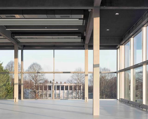 项目用材建筑的主要材料是玻璃和混凝土。玻璃幕墙中嵌入了三轨大型铝合金推拉门,显得十分特别。混凝土梁预先浇筑在工业模具中,而混凝土柱则是现场浇筑的。