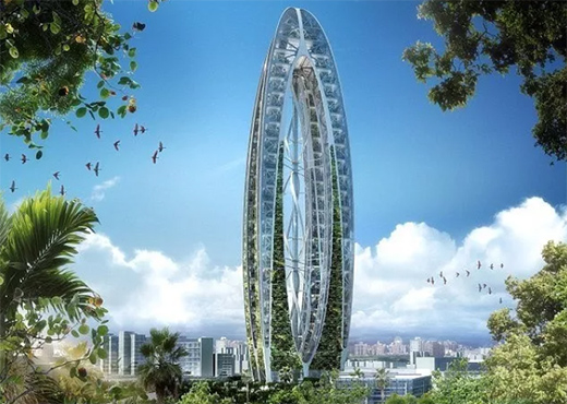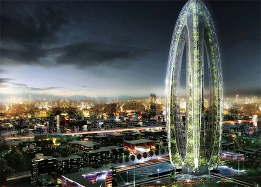 这个未来风格的塔式大厦包含着数千棵树木,通过“吸收”有毒烟雾可以有效解决城市污染问题。它被命名为“仿生拱形摩天大楼”,旨在使用“生物墙”来吸收有害烟雾气体,它能够吸收这些有害气体,并转化成为氧气。