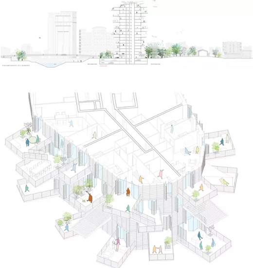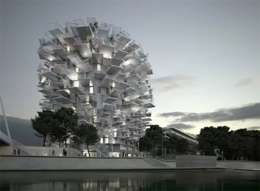这是日本设计师Sou Fujimoto为法国蒙彼利埃设计的一栋集办公、画廊、酒吧与餐厅于一体的综合性建筑物,全高17层,其最大的特点在于,整个建筑物就像棵大树般开枝散叶,让露台和阳台狂放地向四周绽放,从而提供相当多样又实用的户外空间。