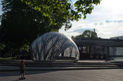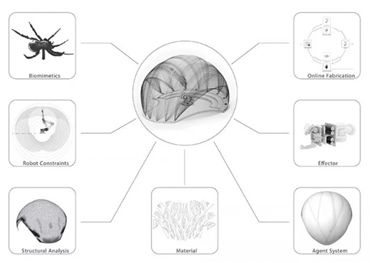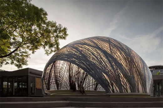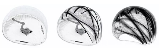 整个亭子是在一层柔软的薄膜内部用机器人织上可以增强结构的碳纤维而形成的轻型纤维复合材料外壳构筑物,同时这种建造方式使用到最少的材料实现了结构稳定性。