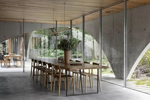 最终,一个独具特色的巨大空间、充满自然风味的户外栖所脱颖而出。整个场地由两个清水混凝土体量筑成,周围植被芬芳蓊郁,从室内任何角落望去,满眼所及皆是它,营造一个富有天然野趣的建筑。