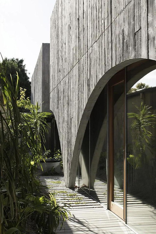 清水混凝土壳体设计是项目最大亮点,十分有趣。首先,它的外立面自然呈现建造时的木模纹理,一条短暂走廊连接两者,其间栽满植物。