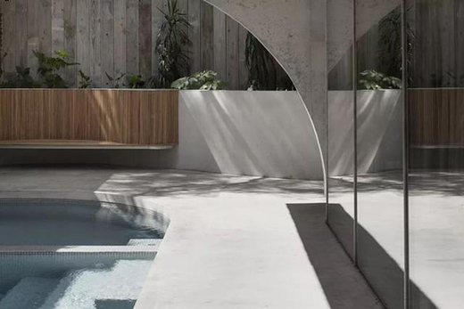 两个建筑体量更像分别戴着清水混凝土外壳,内部空间覆盖其下,收缩后退,使混凝土壳体与室内留出空隙,像一道划分混沌与清晰的边界,很好地区隔生活与自然。