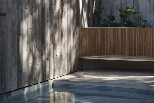 对照清水混凝土体壳,是装饰场地外围的木板——切割旧的混凝土施工用模板,打理干净,露出肌理,令场地呈现岁月成熟的况味,与混凝土天然粗犷表皮相应。