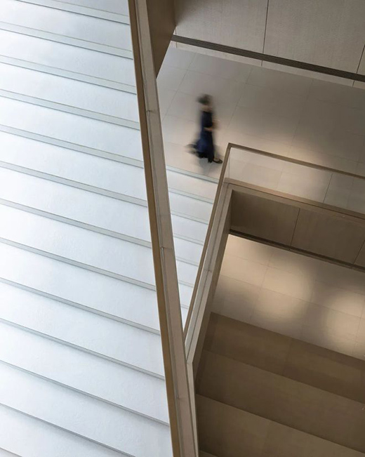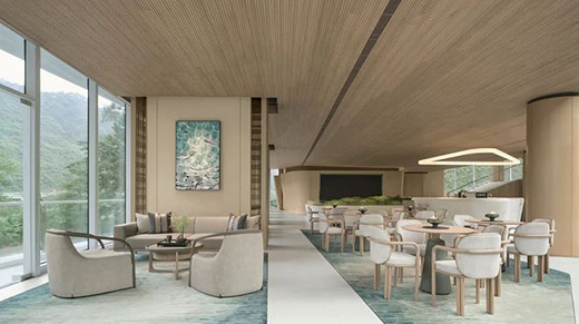 拾级而上,仰视间可见轻盈细软的灯饰,指引着空间精神向上,如虚若影。其间的流光溢彩如同洒满日光的水流,化作自然的艺术手臂,写意澄澈清朗、幽和尔雅的诗境美好。