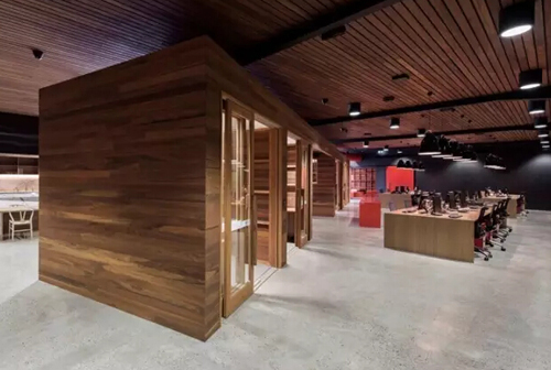 黑色、红色以及原木色为主要的色调,沉稳的色彩搭配加上大量的原木设计搭配,展现出温暖的一面。大量动物骨骼的工艺品和图片分布在办公室的每个角落,展示着企业的行业文化。