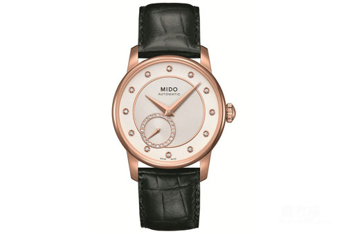 瑞士美度表贝伦赛丽典藏系列纪念款超薄女士腕表,搭载美度1192全自动机械机芯(以ETA 2892A2为基础),表达当代女性端庄外表及无懈的内在力量。黑色小牛皮轧鳄鱼纹真皮表带性感而雅致,搭配PVD镀玫瑰金不锈钢表壳与表扣,于细节中彰显简约、大气的潮流趋势。纯净的象牙白饰纹表盘搭配烤蓝钢秒针,透明表背可清晰观测到其精雕细琢、配以蓝色螺丝的全自动机械机芯,以及雕刻着日内瓦波纹和MIDO标志的自动摆陀。