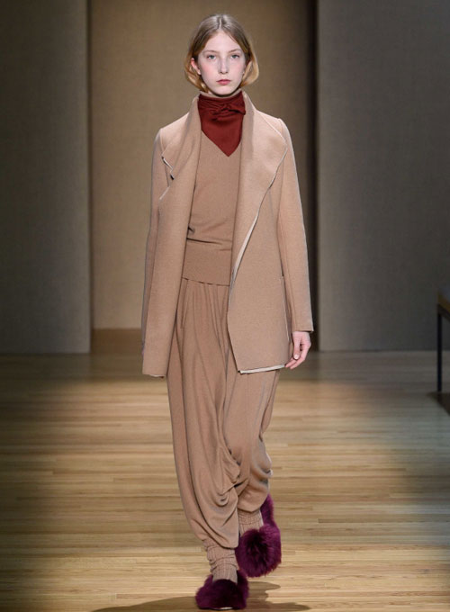 大衣宽松易穿,定制单品及礼服勾勒出修长身形,运动款则玩味叛逆分层设计更具游牧感靴款彰显帅气干练潜藏的佩斯利印花赋予了神秘的美感皮革工艺,皮草细节,以及珠饰花边缔造出精致的轮廓色彩涵盖驼色、灰褐色、焦橙色、紫色、枣红色、以及海军蓝和靛蓝色面料包括双面驼绒,双面羊绒,羊绒和羊毛牛仔,双羊毛貂,羊毛花呢,双羊绒针织,珠饰驼毛针织,斜织马海毛及斑片毛领。轻松自在才是奢华的真谛。