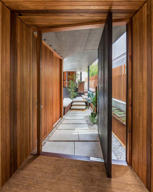 NCplusC建筑工作室最近完成了一个位于悉尼狭窄地段的私人住宅。房子的外观由一个带有窗户和穿孔金属面板的木格栅组成,这些金属板成了垂直绿化的栖息地。从庭院通过一个旋转木质门,便可以进入家中。