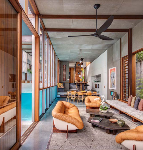 首先看到的是媒体室,从这可以连接到泳池的甲板,接着泳池旁是一个开放式厨房。从厨房步入下台阶,是一个小小的休息过渡空间,在这可欣赏到游泳池的独特风景。走过去就到了起居室,它连通了室内外空间,这里的空间足够大,能保证全家人的娱乐活动。卧室则设置在二楼。