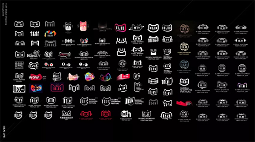 融合说起来容易,这么抽象的文字怎么转换成图形表达,同时还要和猫头+11.11融合,为什么要和猫头+11.11融合呢,因为这是我们重要的品牌形象资产,从2015年开始,猫头+11.11的组合就固定下来了,这意味着logo的80%的主体已经固定,我们的难点就在于在这20%的区域里,如何既要表达主题,还能做出和往年不一样的感觉。我敢向你保证,双十一的logo是所有logo里最难的,没有之一,至少是我十几年职业生涯里最硬的茬。