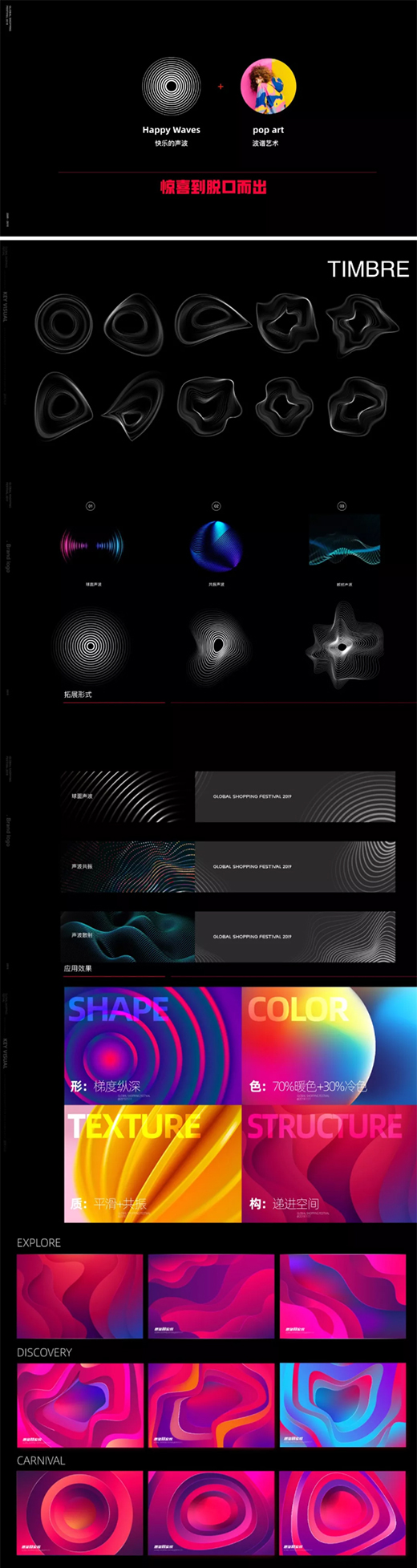 当一个人“惊喜到脱口而出!”的时候,快乐的气场围绕在他周围,这些无形的从中心向四周放散的表现,看上去很像是圆形声波,同时它还能根据不同人的状态做动态变化,这就形成了一种设计语言,一种能用固定的形式做出千变万化的效果的语言。
