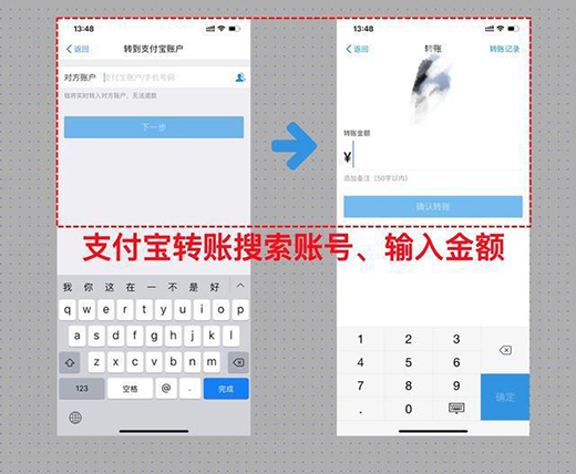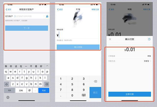支付宝付款输入密码属于转账环节“输入账户-输入金额-输入密码”中最后、最重要的一步操作,从底部弹窗,视线移动刺激视觉,与以上两步骤形成对比,将转账这一操作分解成了两个有对比效果的视觉内容。