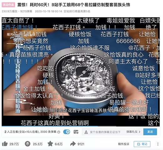去年,花西子与手工区UP主“雁鸿Aimee”合作推出的《震惊!耗时60天!B站手工娘用68个易拉罐仿制整套苗族头饰》火爆全网,就是双赢的典型案例。