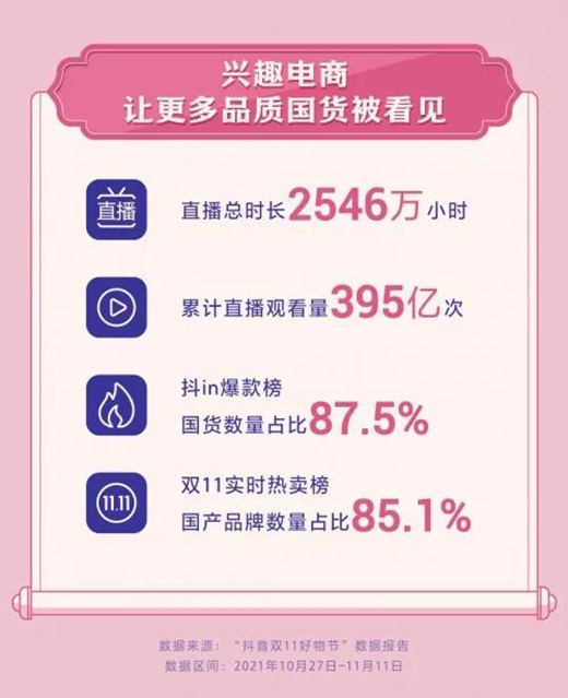 其中,抖音双11好物节期间(10月27日-11月11日),商家自播总时长达1227万小时,总体累计看播人次395亿,品牌成交额破千万(含破亿)的品牌达577个,单场成交额破千万(含破亿)直播间282个。