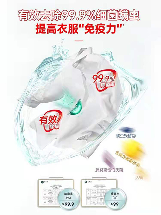 我们每天接触外界,穿的衣服上其实有很多看不见的细菌,这是很正常的,但是长期下来可能会形成病菌隐患,危害我们的健康。比如出现交叉污染产生异味;细菌滋生、螨虫附着等导致皮肤过敏的问题,因此,衣物也是需要“提高免疫力“的,干净是基础,除菌也很重要。立白除菌洗衣凝珠的除菌率高达99.9%,能够有效帮助袪除细菌和螨虫,而且长效抑菌多达72小时,衣服即使阴干也可以像在日光下晾晒一样清新。