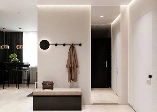玄关作为室内外的一个缓冲区,空间比较狭小,在灯光上可以选择筒灯、射灯、灯带,在鞋柜上做感应式灯带给晚归的人提供一个方便的照明。