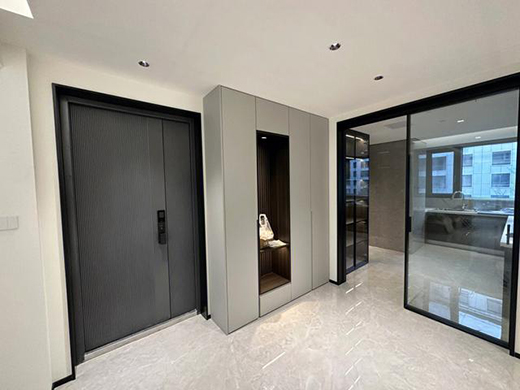 户型其实还是比较宽敞的,但是从入户进来是没有玄关的说法,但是利用入户门一边的位置,设计了一个直接到顶的储物柜,类似一个衣柜的感觉,储物空间还是比较宽敞的。第一次见这样的柜子设计,还是比较个性的哈。把原本的入户门换了现在的灰色的,与整个空间刚好搭配起来。同时,通过厨房安装的透明玻璃推拉门,可以给室内一些采光,光线非常充足呀。