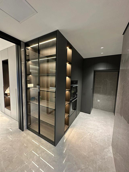 厨房这边有个位置,设计柜子的时候,预留了可以放冰箱的位置,考虑非常周到,很是让人喜欢,也很有设计感呀。柜子都是全屋定制的,质量与做工真心不错呢。