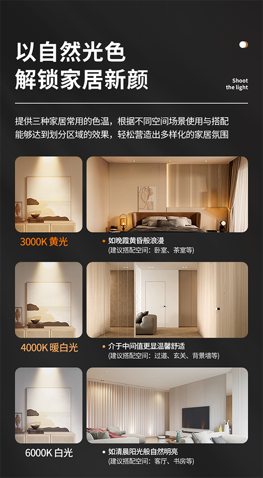 综合考虑光谱、照度,光分布等维度,融合筒灯、射灯、格栅灯、餐吊灯的优势于一体。可以与任意家居空间完美契合,满足用户多元化的照明场景需求。
