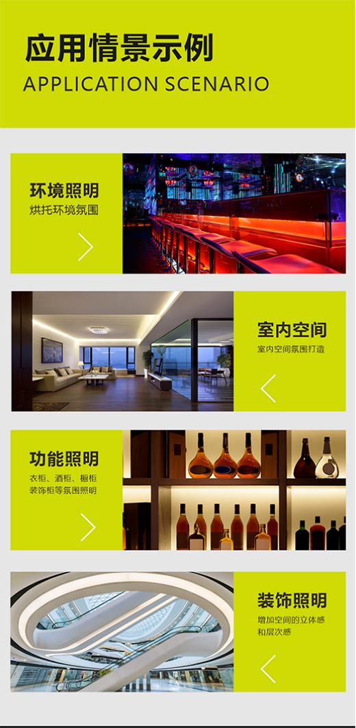 当灯带安装在天花、墙面、玄关柜、餐边柜、或者衣帽间时,不仅起到照明功能,更映照得空间环境更具层次感,低调奢华。