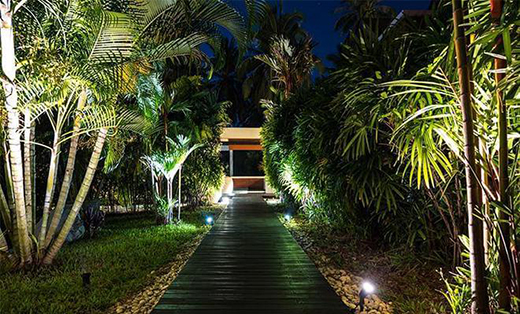 灯具光源的颜色选择也需要根据对象来确定。就植物照明而言,通常使用白色和绿色。很多人认为使用绿光可以衬托出绿色植物的本色,但大面积的绿光给人一种阴森森的感觉。,中间需要加白光来点缀。如果有其他颜色的植物,比如红枫、竹林或者其他颜色的假山,最好补充其他颜色的灯光,整体的灯光效果会大大提升。