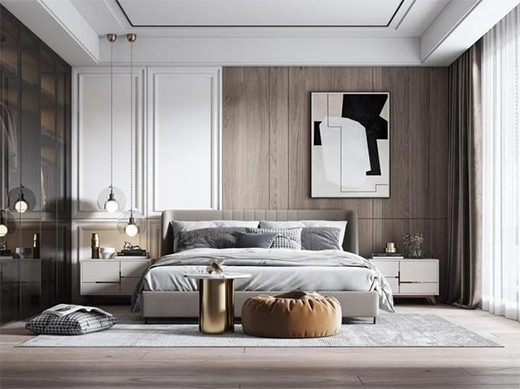 床头墙与沙发墙一样作为靠放大件家具的墙面,换成木质感的就显得更加厚实稳重,自然舒适的木材质感,也能让空间显得更加精致舒适,提升卧室空间的温馨情趣。