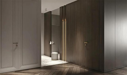 玄关区域迎来送往,起到隔绝室外保护室内私密性的作用,木饰面玄关墙面给人以温暖的视觉感受,传递出自然温馨的家庭氛围,同时耐脏易打理,保持玄关的档次和气质。