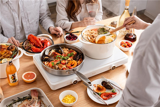 早晨上班前时间紧凑,准备一家的早餐常常会手忙脚乱。使用适盒聚嗨炉的左右分区功能,早餐左边区域用来煎鸡蛋、培根等,右边可以放置一口锅来煮粥;晚餐左边用来炒菜,右边用来煮汤,一次性搞定全家早晚饭,省时又省力。