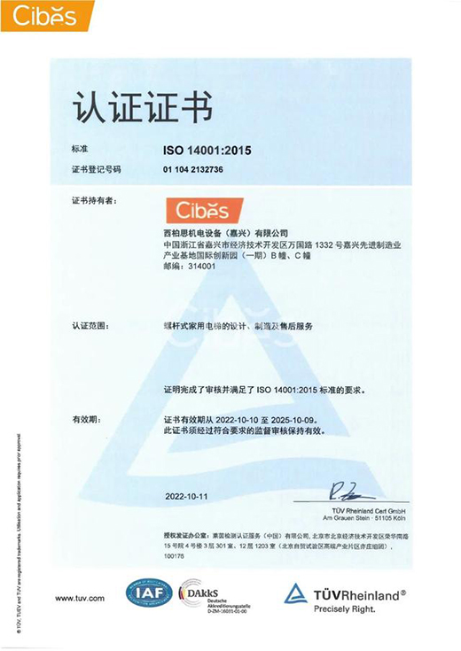 - 西柏思螺杆电梯喜获ISO14001环境管理体系认证证书 - 2022/10/14