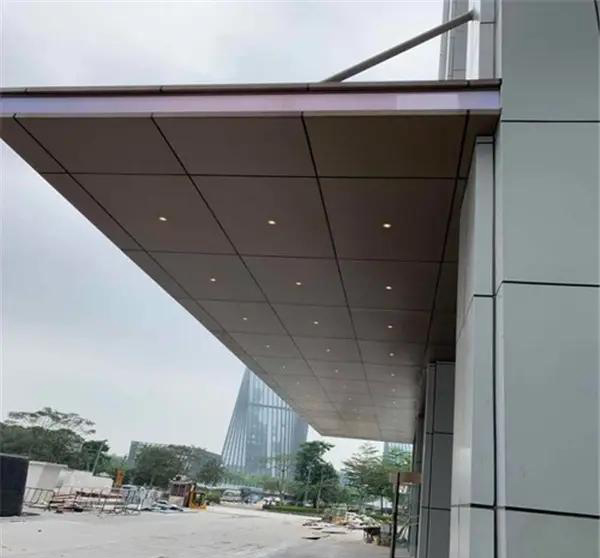 雨棚铝单板具有质量轻、强度高、刚性好等特点,耐候抗压,能长久抵抗风吹日晒、霜雪暴雨等恶劣环境。