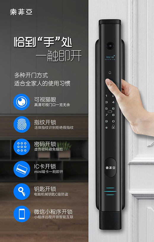 索菲亚指纹锁,是全民智能家居生活的重要拥护者,也是智能门锁产品的重要耕耘者。其凭借多年来在智能领域所积累的实用经验与所掌握的先进技术,不断为当代消费者带来性价比高且时尚智能的指纹锁产品,同时也为老百姓缔造时尚便捷的新生活做出了非凡的贡献。而在塑造产品、升级产品的过程中,索菲亚团队善于总结其他智能产品的发展经验及尖端技术,也善于结合门锁的使用实际与潮流趋势,力争将智能科技运用得淋漓尽致,修炼出专属于索菲亚的强大内功。