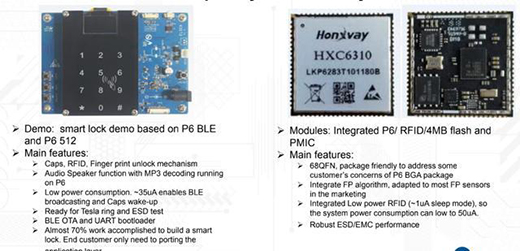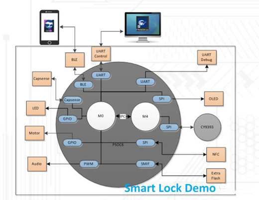 据介绍,该方案有如下特点,在系统功能上支持多种解锁方式如指纹,密码,BLE和NFC卡等,而且是高度集成的,它集成了。BLE、电容触摸、加密、指纹匹配算法(Yoyon)、音频播放、,OLED驱动功能等,指纹识别方面可以支持100个指纹注册,匹配时间可以完成<1s @ 100指。支持两种通讯工具(BLE和UART)用于调试FP功能。在其内部,CM0 +内核用于运行智能电子锁应用程序代码,CM4内核用于运行匹配器。