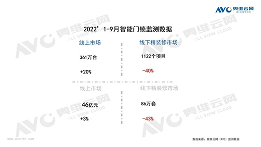 从精装修市场来看,2022年1-9月精装修市场智能门锁配套项目个数1122个,同比下降40%;配套规模为86万套,同比下降43%。TOP5品牌依次为坚朗海贝斯、凯迪仕、飞利浦、亚太天能、名门,市场集中度为49%,同比上升4%。