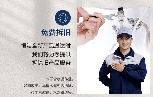 恒洁提供恒洁智能马桶2小时快速换装服务,从旧品拆除到智能换新,升级品质生活仅需2小时。