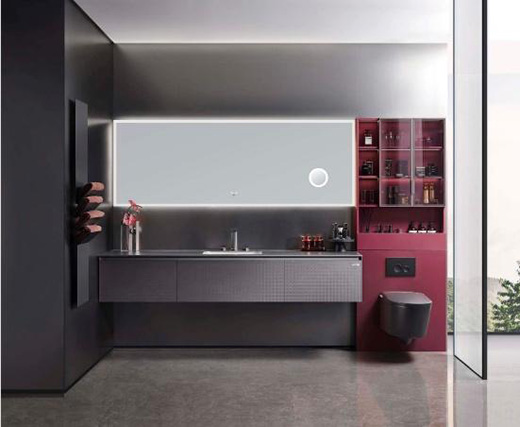 欧派卫浴“魅力伯爵”系列,选择极简门型的深灰色立体纹岩板,搭配魅惑红哑光烤漆格柜,迸发沉稳内敛与热情狂放的剧烈碰撞,带来更突出的视觉冲击感与设计高级感。一字型布局设计搭配门板与拉手的一体化设计,从整体到细节一致实现简约质感,明暗相间的肌理以及错落有致的布局都在简约感中加入协调的富于层次感的多元化设计元素,显得更为精致。