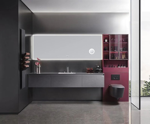 将两者结合用于卫浴之中,赋予空间独特魅力,沉稳内敛的灰和热情活力的红相互碰撞,理性和感性结合,让整个空间充满高级气场与先锋格调。