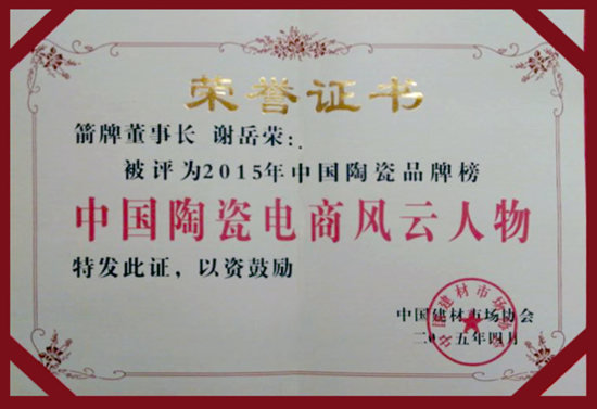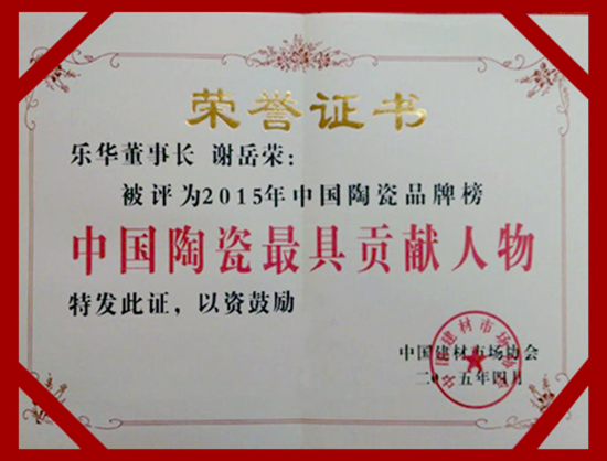 2015年4月21日,由中国陶瓷新闻网和佛山陶瓷网联合发起,中国建材市场协会主办的2015“中国陶瓷品牌榜”颁奖盛典在广东省佛山市禅城区中国陶瓷产业总部基地陶瓷剧场3楼多功能会议中心隆重举行。据悉,本次评选活动历时半年之久,采用网络投票形式,实行微信一人一票制度,过程公正而且严格。经过激烈的投票角逐,乐华集团董事长谢岳荣先生获得了“2015年中国陶瓷品牌榜——中国陶瓷最具贡献人物”以及“2015年中国陶瓷品牌榜——中国陶瓷电商风云人物”奖项。
