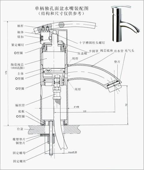 我们可以看到面盆的结构图还是非常的复杂的,它是单把陶瓷阀芯面,主要由手柄、阀芯、进水编织管和安装小配件组成。其中还包括了一些密封圈,螺杆等等。